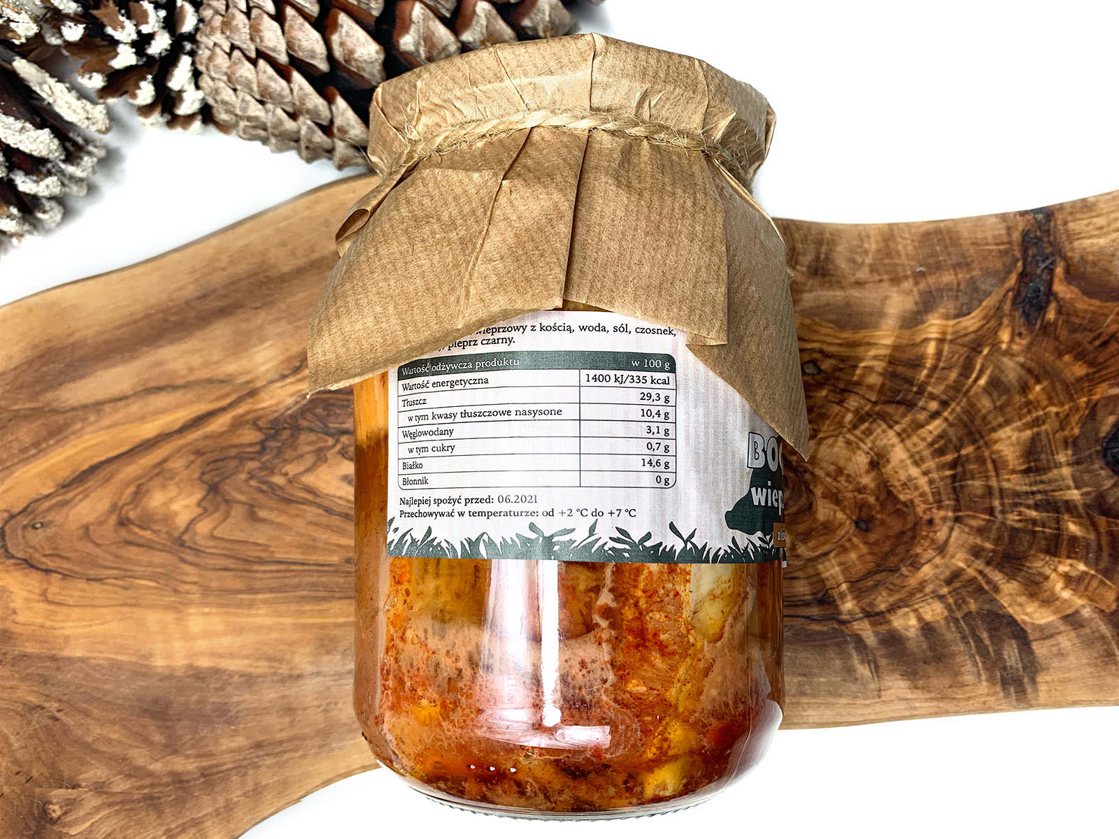 Składniki: boczek wieprzowy z kością (90%), woda, sól, czosnek, liść laurowy, pieprz czarny.