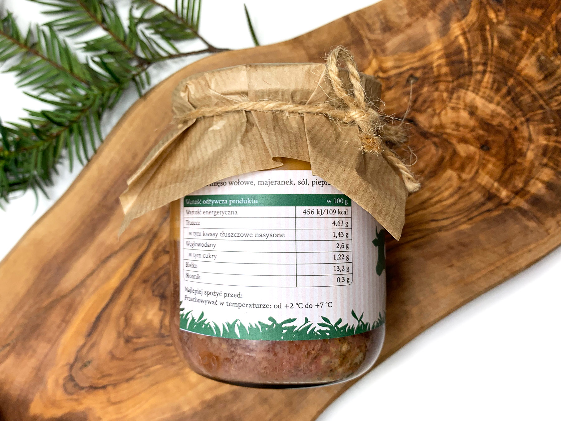 Składniki: mięso wołowe (85%), marchew, cebula, majeranek, czosnek, sól, pieprz czarny.