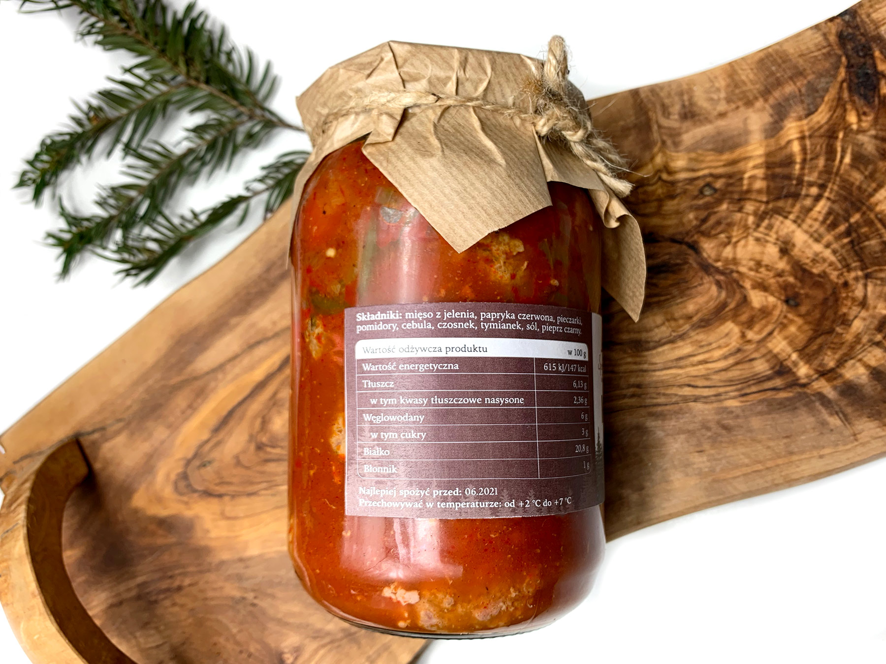 Składniki: mięso z jelenia (80%), papryka czerwona, pieczarki, pomidory, cebula, czosnek, tymianek, sól, pieprz czarny.