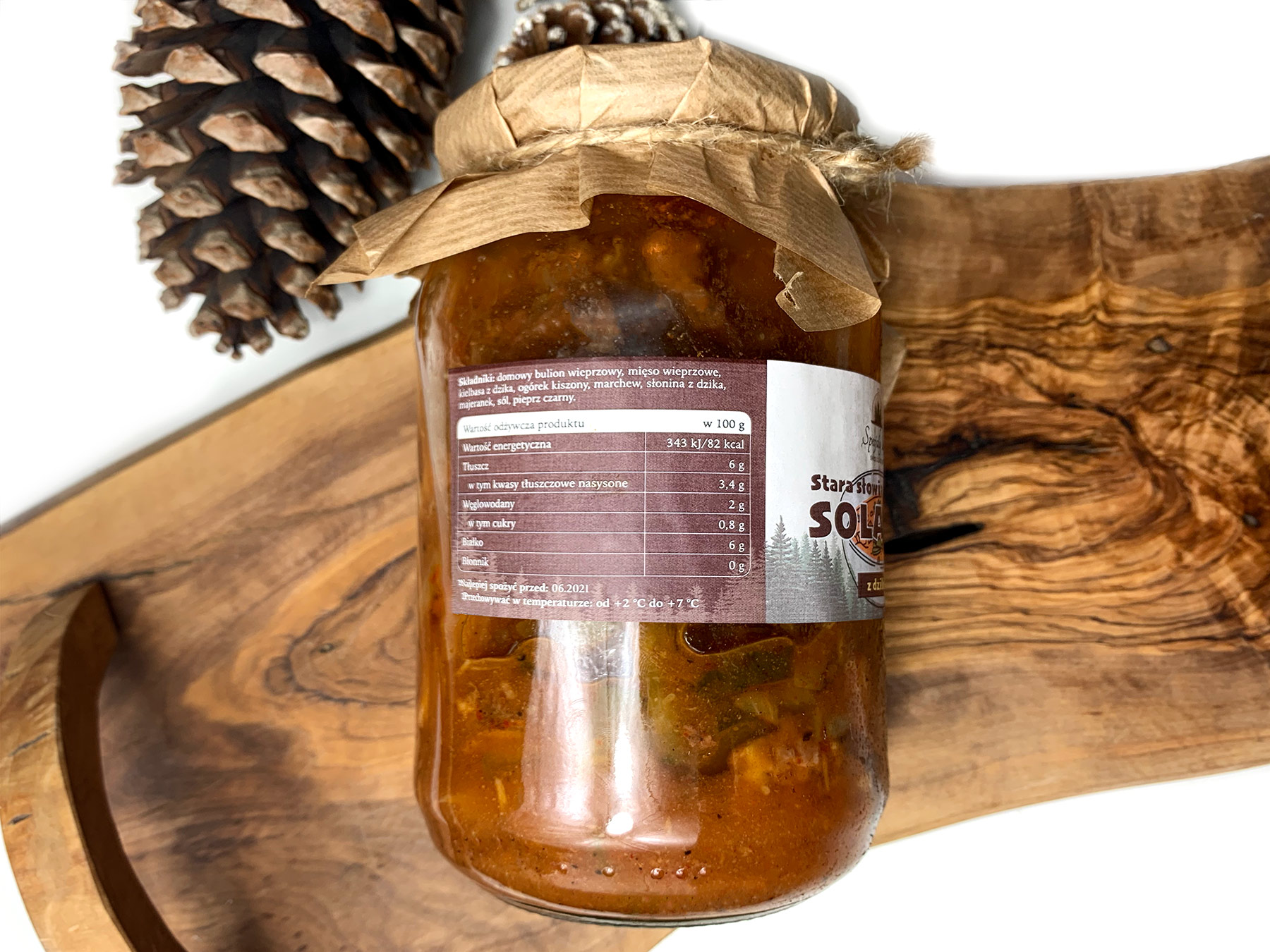 Składniki: domowy bulion wieprzowy, mięso wieprzowe (30%), kielbasa z dzika (10%), ogórek kiszony, marchew, słonina z dzika (5%), majeranek, sól, pieprz czarny.