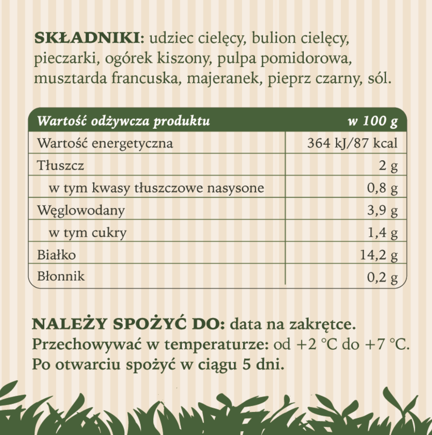 Składniki: udziec cielęcy (80%), bulion cielęcy, pieczarki, ogórek kiszony, pulpa pomidorowa, musztarda francuska, majeranek, sól, pieprz czarny.